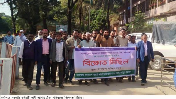দুর্গাপুর (নেত্রকোনা) প্রতিনিধি : নেত্রকোনার দুর্গাপুর উপজেলার সকল সরকারি দপ্তরের কর্মচারীদের সমন্বয়ে নবম জাতীয় পে-স্কেল ঘোষনার দাবিতে এক বিক্ষোভ মিছিল অনুষ্ঠিত হয়েছে। বুধবার (২৮ জানুয়ারী) দুপুরে উপজেলা পরিষদ চত্বরে এ