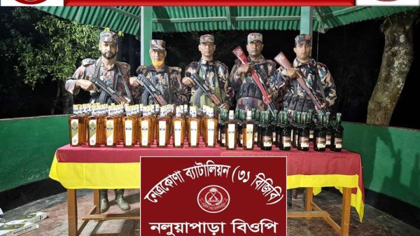 দুর্গাপুর (নেত্রকোনা) প্রতিনিধি : নেত্রকোনার দুর্গাপুরে বিজিবি‘র অভিযানে ভারতীয় বিভিন্ন ব্র্যান্ডের ৭১ বোতল মদ জব্দ করা হয়েছে। সীমান্তবর্তী ২নং দুর্গাপুর ইউনিয়নের গোপালপুর এলাকায় অভিযান চালিয়ে মালিকবিহীন অবস্থায় ভারতীয় মদ গুলো