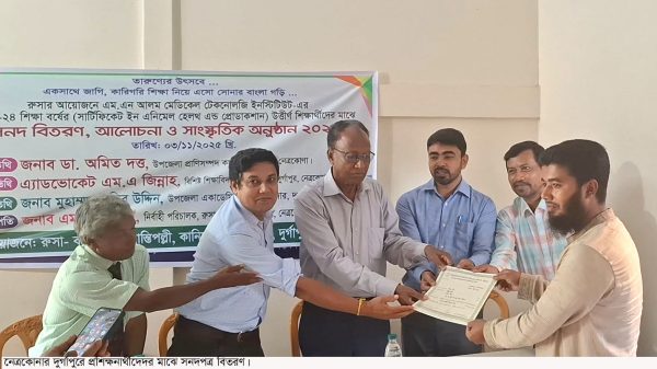 দুর্গাপুর (নেত্রকোনা) প্রতিনিধি : নেত্রকোনার দুর্গাপুরে বাংলাদেশ কারিগরি শিক্ষা বোর্ডের আওতায়, বে-সরকারি উন্নয়ন সংস্থা ‘‘রুসা বাংলাদেশ’’ এর আয়োজনে “সার্টিফিকেট ইন এনিমেল হেলথ অ্যান্ড প্রোডাকশন” একবছর মেয়াদী কোর্স সমাপ্ত হয়েছে। সোমবার
