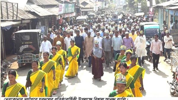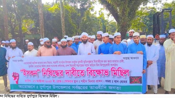দুর্গাপুর (নেত্রকোনা) প্রতিনিধি : ইসকনকে অবিলম্বে নিষিদ্ধ এবং দেশের বিভিন্ন জায়গায় মুসলিম তরুণীদের টার্গেট করে হিন্দু সংঘবদ্ধ চক্র কর্তৃক ধর্ষণ এবং গাজীপুরে ইমামকে গুম করার ঘটনার প্রতিবাদে নেত্রকোনার দুর্গাপুরে এক