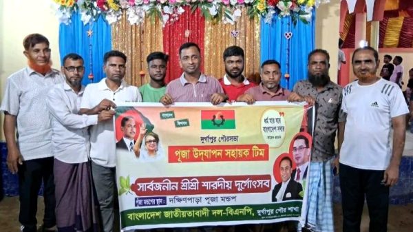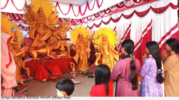 দুর্গাপুর (নেত্রকোনা) প্রতিনিধি : ‘‘ধর্ম যার যার – বাংলাদেশ সবার’’ এই প্রতিপাদ্যে হিন্দু ধর্মাবলম্বীদের সবচেয়ে বড় ধর্মীয় উৎসব শারদীয় দুর্গাপূজাকে ঘিরে সারাদেশের মতো নেত্রকোণার দুর্গাপুরেও উৎসবমুখর পরিবেশ বিরাজ করছে। এতে
