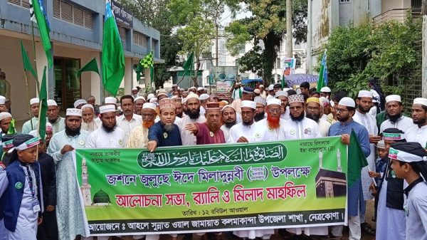 কলমাকান্দা (নেত্রকোনা) প্রতিনিধি : নেত্রকোনার কলমাকান্দায় পবিত্র ঈদে মিলাদুন্নবী (সা.) উপলক্ষে জশনে জুলুস, আলোচনা সভা, র্যালি ও মিলাদ মাহফিল অনুষ্ঠিত হয়েছে। শনিবার (৬ সেপ্টেম্বর) উপজেলা পরিষদের হলরুমে আহলে সুন্নাত ওয়াল জামাত কলমাকান্দা
