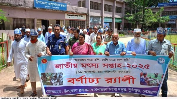 দুর্গাপুর (নেত্রকোনা) প্রতিনিধি : ‘‘অভয়াশ্রম গড়ে তুলি – দেশি মাছে দেশ ভরি’’ এই প্রতিপাদ্যে নেত্রকোনার দুর্গাপুরে উপজেলা প্রশাসন ও মৎস্য অধিদপ্তরের আয়োজনে জাতীয় মৎস্য সপ্তাহ ২০২৫ পালিত হয়েছে। উপজেলার বিভিন্ন